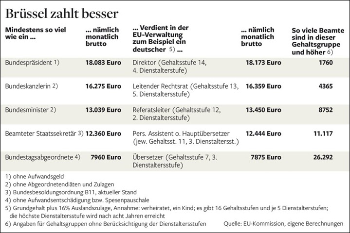 »Die Welt« berichtete am Wochenende, was wieviele Beamte des Bürokratiemonsters des Brüsseler Zentralkomitees so verdienen — und da gehen einem doch etwas die Augen über (und das sprichwörtliche Taschenmesser im Hosensack auf!), wenn man sich die Tabelle so ansieht: